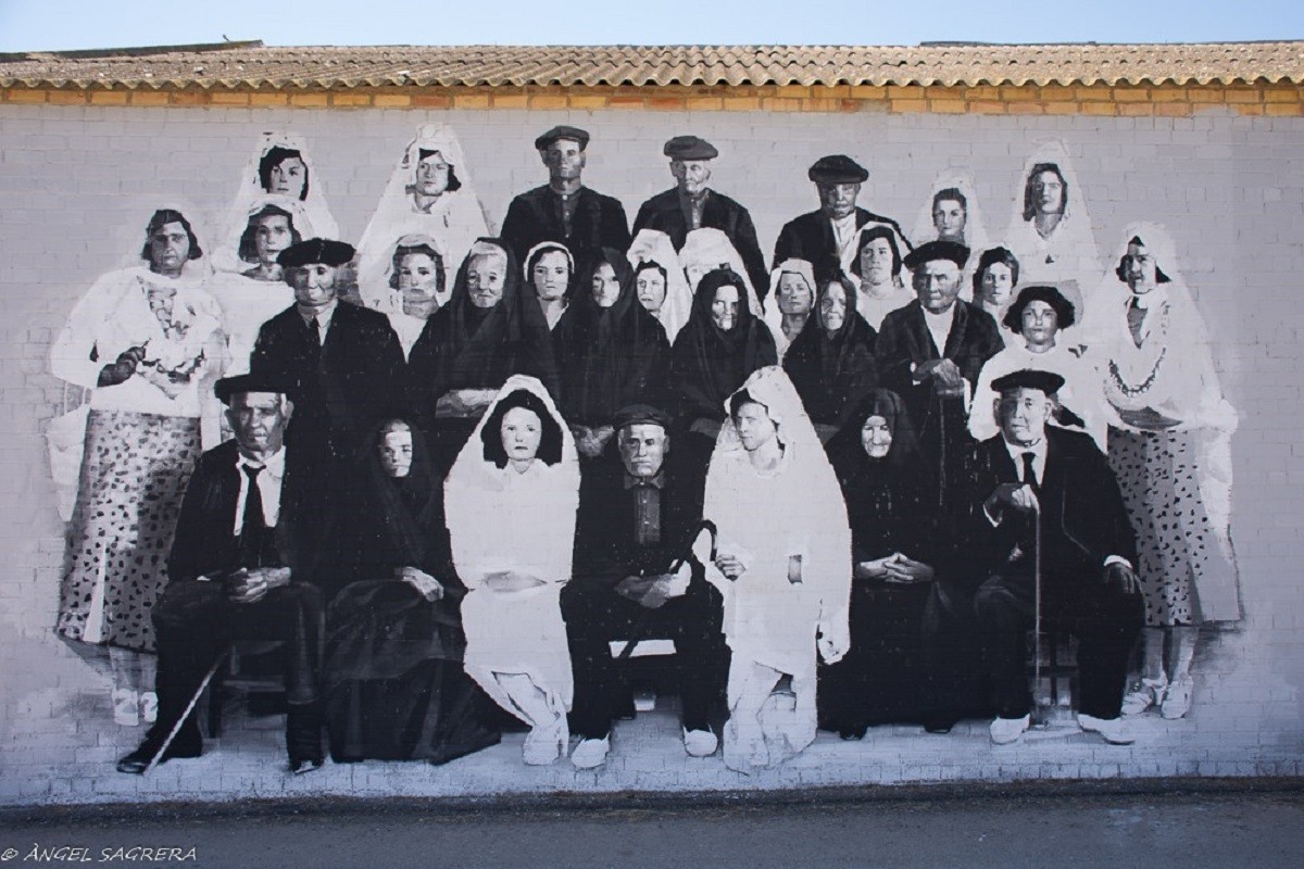 Pintura mural de una foto de familia. Arte urbano en Penelles (Lleida)