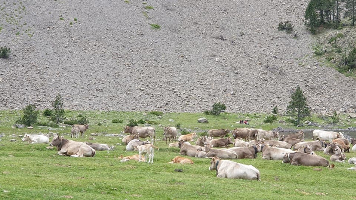 Rebaño de vacas junto al Ibón de la Bassa de la Mora en Plan. Huesca